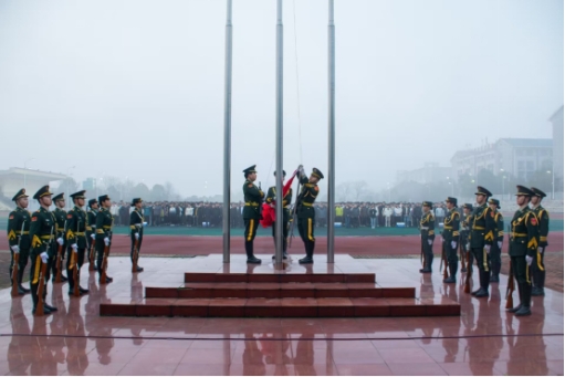 上午7时整,升旗仪式正式开始。伴随着铿锵有力的步伐,国旗护卫队护卫着鲜艳的五星红旗庄严入场。在雄壮的《义勇军进行曲》中,五星红旗迎着朝阳冉冉升起,在南华广场上空迎风飘扬。全体师生肃立注目,齐声高唱国歌,展现出昂扬的精神风貌和深厚的爱国情怀。