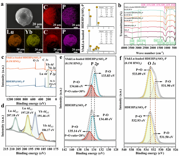 研究结合SEM-EDS、FT-IR、XPS及密度泛函理论(DFT)计算,对材料的选择性分离机制进行了系统分析。结果表明HDEHP分子中的P=O基团是与Yb3+和Lu3+发生配位作用的关键活性位点。理论计算进一步显示,HDEHP与Lu3+形成的复合结构结合能更低、稳定性更高,从分子层面证实材料对Lu3+的优先吸附与选择性分离能力。