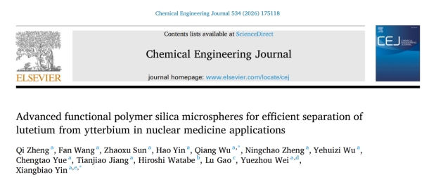 论文引用:Advanced functional polymer silica microspheres for efficient separation of lutetium from ytterbium in nuclear medicine applications.Chemical Engineering Journal(2026), 534:175118.https://doi.org/10.1016/j.cej.2026.175118