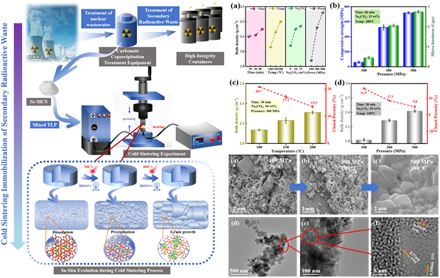 为破解这一行业痛点,团队秉持“创新破局”的思路,创新性地将冷烧结技术(Cold SinteringProcess)应用于放射性污泥固化处理,自主开发了基于低温高压条件的锶固化新工艺。该技术以15 wt% 1M Na₂CO₃为瞬态液相,在200℃低温、500 MPa高压条件下烧结1小时,成功将含锶碳酸盐污泥转化为高密度、高稳定性的陶瓷固化体。材料表征结果表明,固化体相对密度达96%,抗压强度高达719 MPa(约为普通混凝土的10倍),显微硬度达2.69 GPa,展现出优异的机械性能。