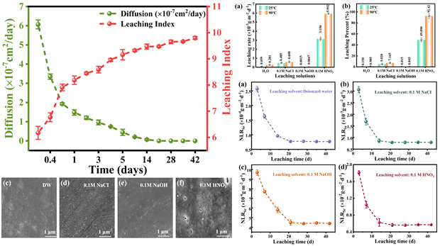 研究采用国际标准的MCC-1静态浸出、ANSI/ANS-16.1加速浸出和PCT产品一致性测试,全面评估固化体的化学耐久性。结果表明,固化体在90℃下浸泡42天后,去离子水中锶浸出率低至5.95×10⁻⁵ g·m⁻²·day⁻¹,浸出指数达9.8,远超国际核废料处置安全标准。在酸性(0.1M HNO₃)、碱性(0.1M NaOH)及盐溶液(0.1M NaCl)等严苛环境中,固化体仍保持结构完整,表面仅轻微腐蚀,展现出超稳定的化学耐久性。