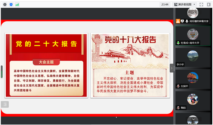 2022年10月20日下午16:30—17:30,PA视讯,PA视讯教师第一党支部进行了2022年第6次教职工理论学习暨中共二十大报告精神学习讨论会。鉴于当下疫情复杂的态势,特开展线上集中学习讨论会,本次会议由党支部书记杜雪成主持。