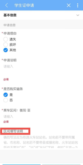 根据区间填写说明填写理由及区间,磁条即学生购票优惠卡,衡阳本地人无法购买磁条,特殊原因请备注原因。